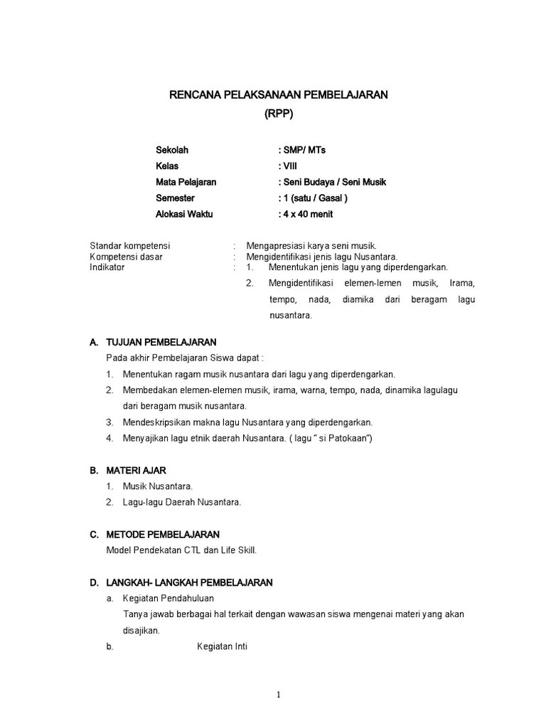Rpp 1 lembar seni budaya tersebut gurunesia bagikan secara khusus kepada bapak/ibu yang bertugas mengajarkan mata pelajaran seni budaya pada jenjang smp/mts .